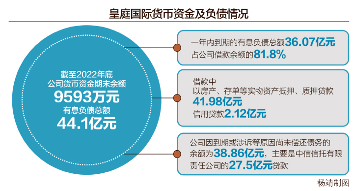在2月7日晚上披露的回复公告中,皇庭国际表示,截至2022年底,公司货币资金期末余额为9593万元,有息负债总额为44.1亿元,其中一年内到期的有息负债总额为36.07亿元,占公司借款余额的81.8%,但是借款中以房产、存单等实物资产抵押、质押贷款为41.98亿元,信用贷款为2.12亿元。