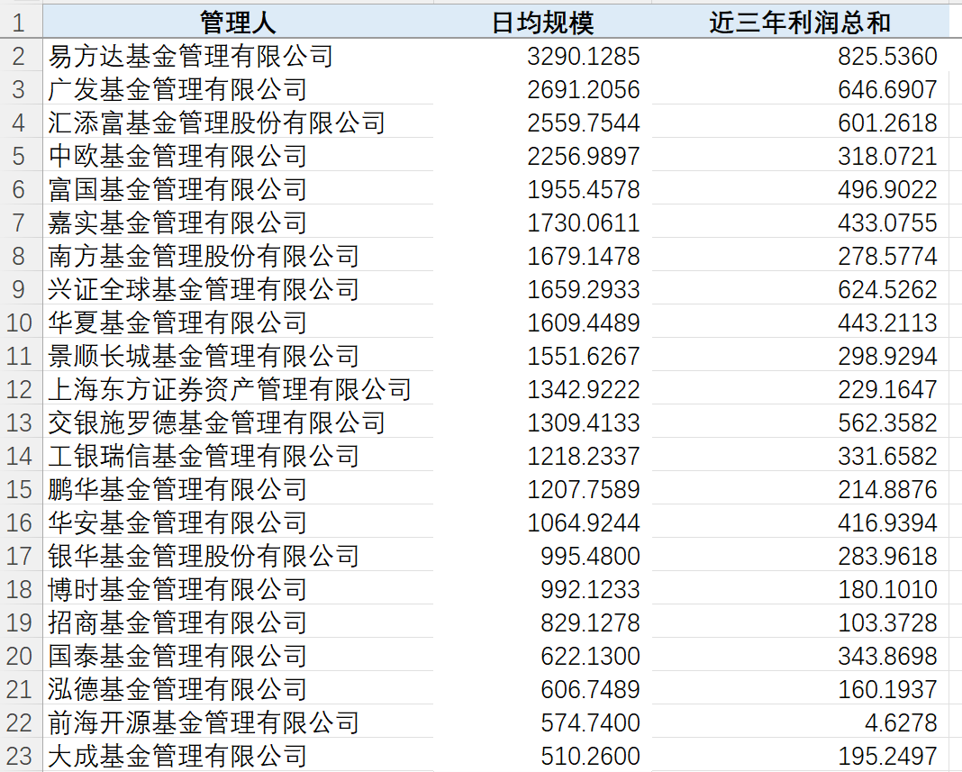 济安金信基金评价中心的统计数据显示,利润总额超过300亿元的12家头部基金公司所创造的利润总额,占全市场主动权益类产品利润总额的48.35%,马太效应较为显著。管理主动权益类基金日均资产超过500亿元的公司一共有22家,这22家基金公司过去三年利润总和为7993亿元。