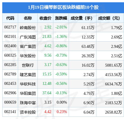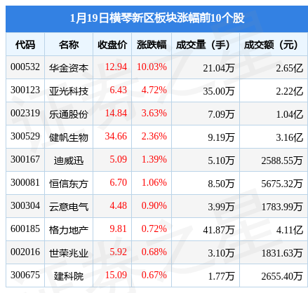 1月19日横琴新区板块较上一交易日上涨0.6%,华金资本(000532)领涨。当日上证指数报收于3240.28,上涨0.49%。深证成指报收于11913.26,上涨0.87%。横琴新区板块个股涨跌见下表:
