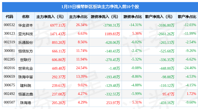 从资金流向上来看,当日横琴新区板块主力资金净流入1304.56万元,游资资金净流出2388.92万元,散户资金净流入1084.37万元。横琴新区板块个股资金流向见下表: